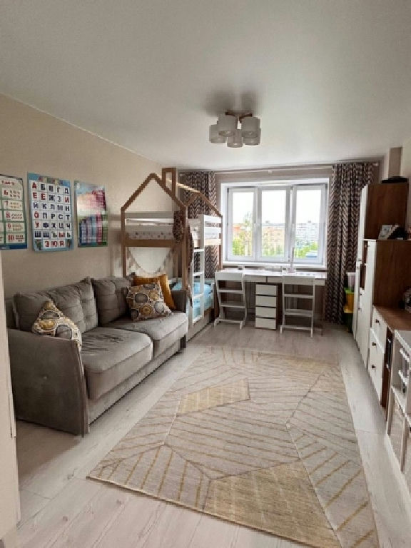 Квартира в отличном состоянии, с очень удобной планировкой, две изолированные комнаты (спальня и детская), гостиная комната объединена с кухней, большой застеклённый балкон, просторный коридор и санузел. Идеальный вариант для семьи с детьми.